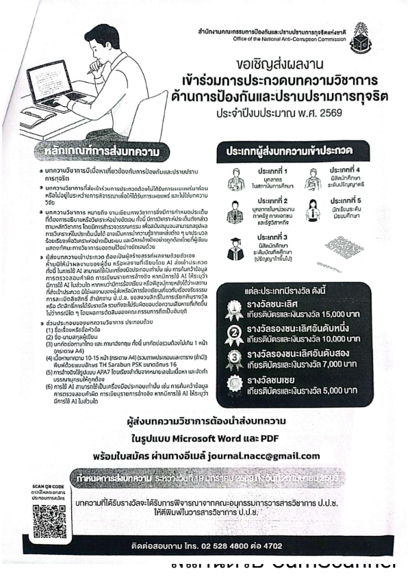 ขอเชิญส่งผลงานเข้าร่วมประกวดบทความวิชาการด้านการป้องกันและปราบปรามทุจริต